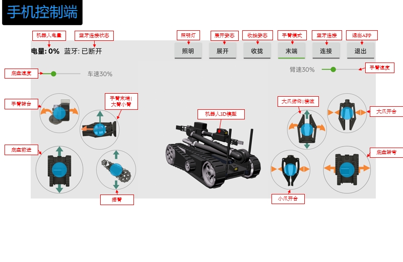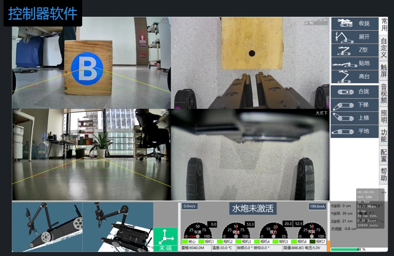 - 软件重构:采用Windows或Android系统,实时3D显示,16个自定义姿态,远程广播喊话,集成水炮控制,用户自定义习惯配置,同步投屏等功能;另有手机端控制APP让控制变得无比简单;
