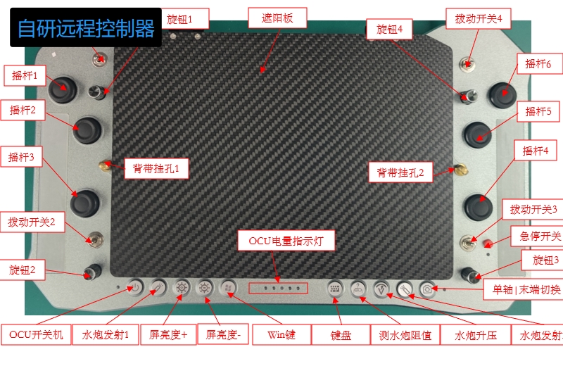 - 远程控制器重构:采用手持式控制器(重量小于3kg),集成远距离通信模块无需中继。多摇杆设计,多按键设计,每个控制有独立的实体控件无需复用,可根据机器人特点配置最合理的控制方式;